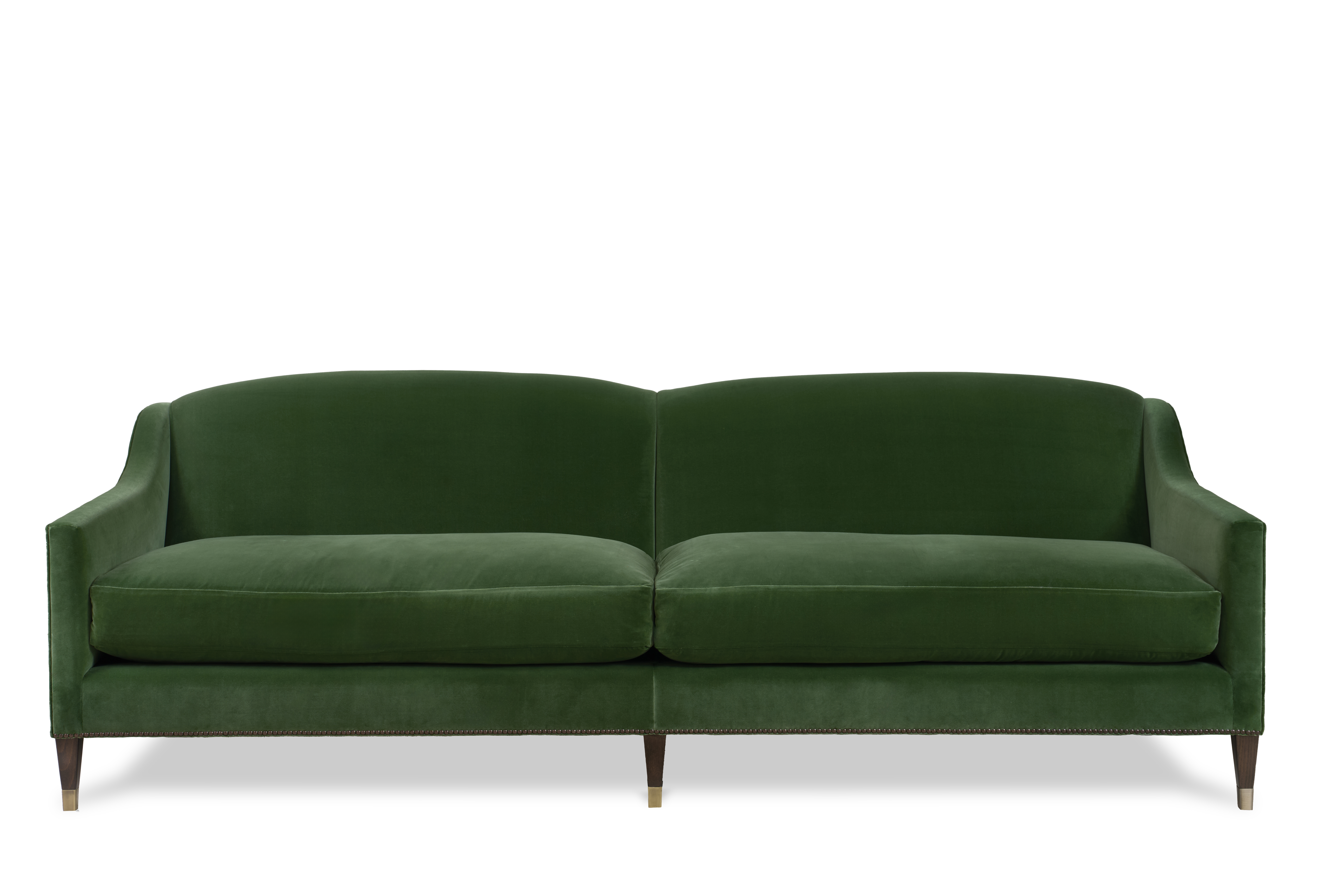 Fully upholstered sofa in fern green velvet. The Alcott Sofa showcases bronze stud detailing, square tapered legs with bronze foot caps, elegant sloped arms, and deep seat cushions.
