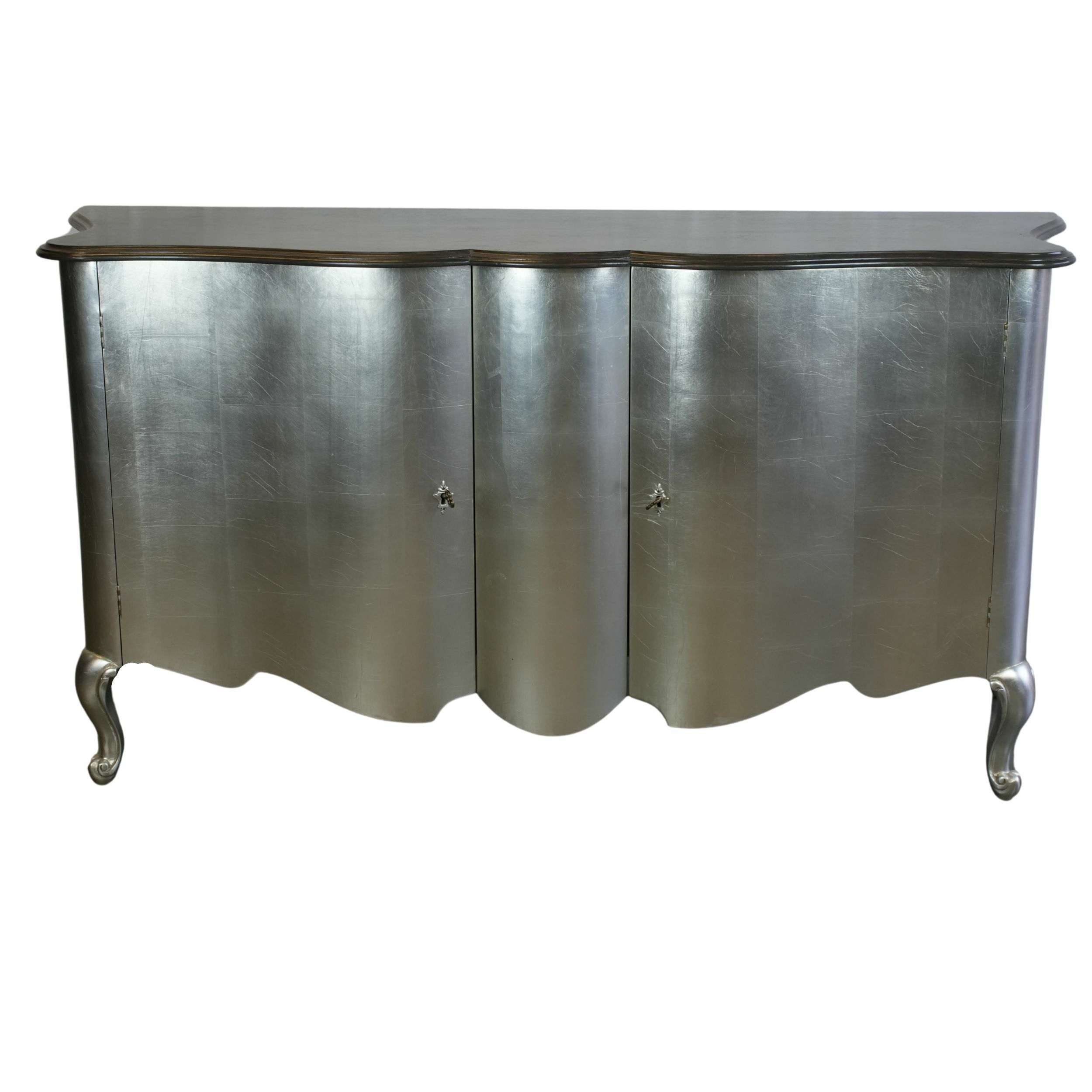 Elevate your interior with this striking, silver-leaf–finished credenza. Crafted using a specialist hand-applied technique, the piece features a beautifully contoured front profile and elegant sculpted legs, giving it a refined, statement-making presence in any room.