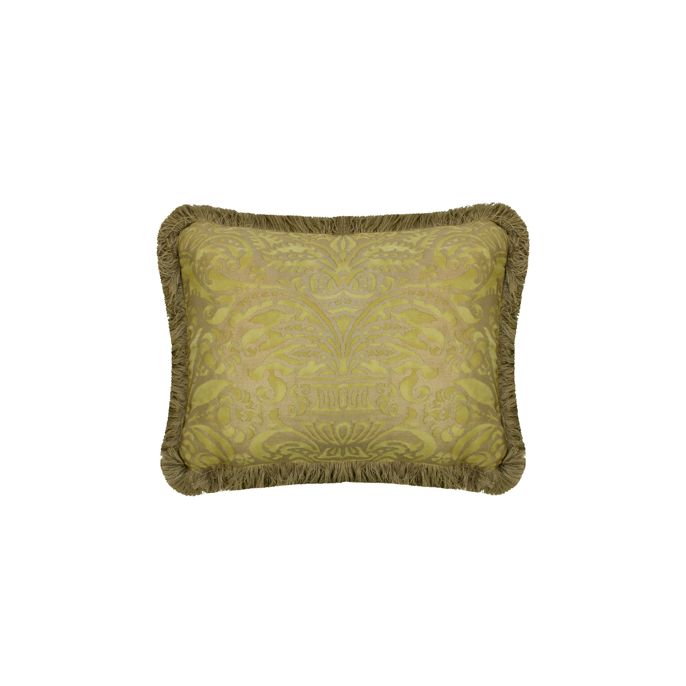 Sophisticated gold cushion featuring a Baroque-inspired design, beautifully finished with a soft fringe. This cushion is perfect for giving a touch of colour to an armchair.