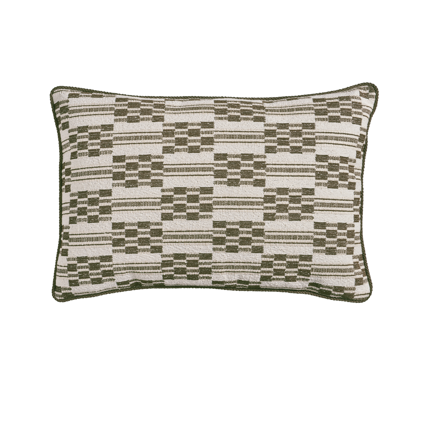 Cushion featuring a dark green geometric design on one side and a complementary linen back. Its versatile style offers a colourful accent or a more understated look, perfect for layering on a sofa, armchair, or bed.