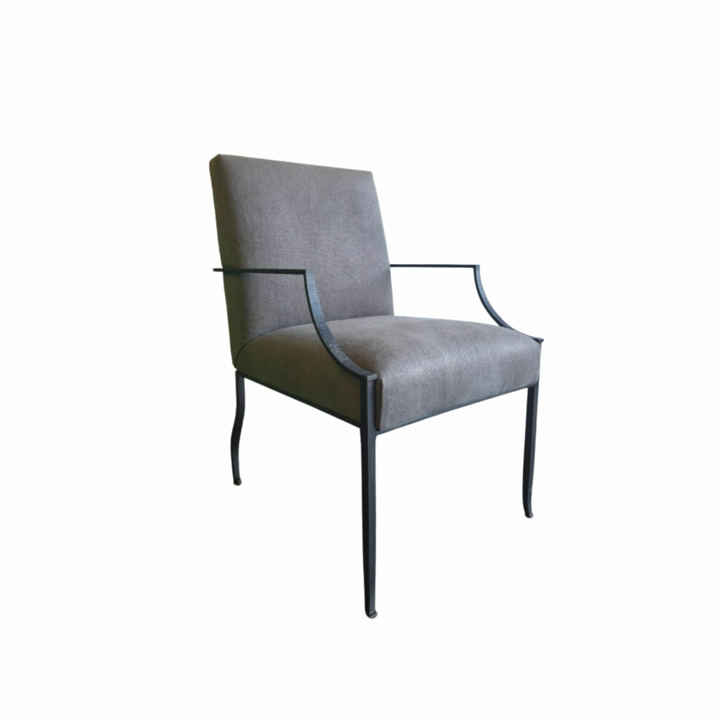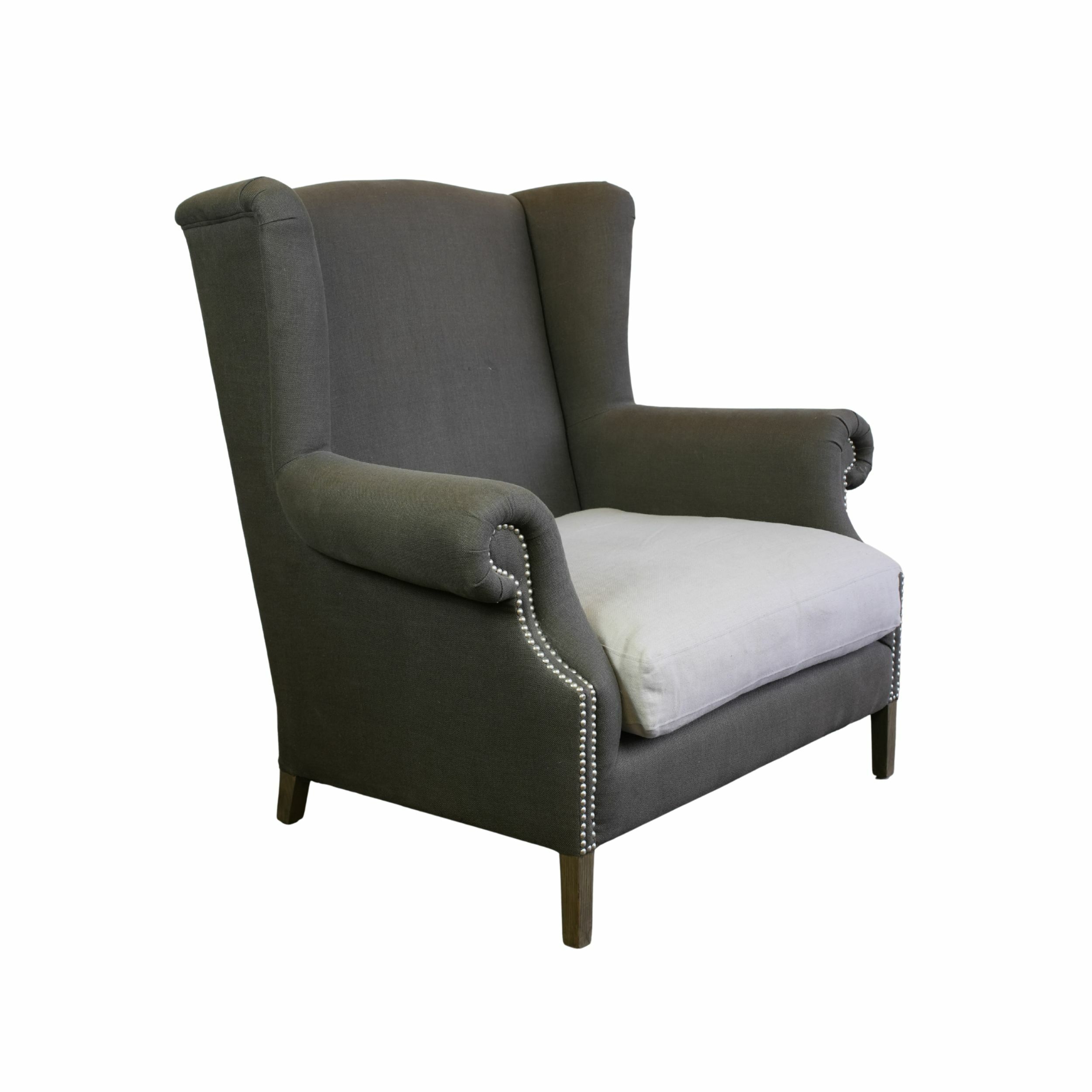 This classic wingback armchair features a high back and rolled arms. The design includes dark grey upholstery and a contrasting cream cushion, accented with stud detailing.