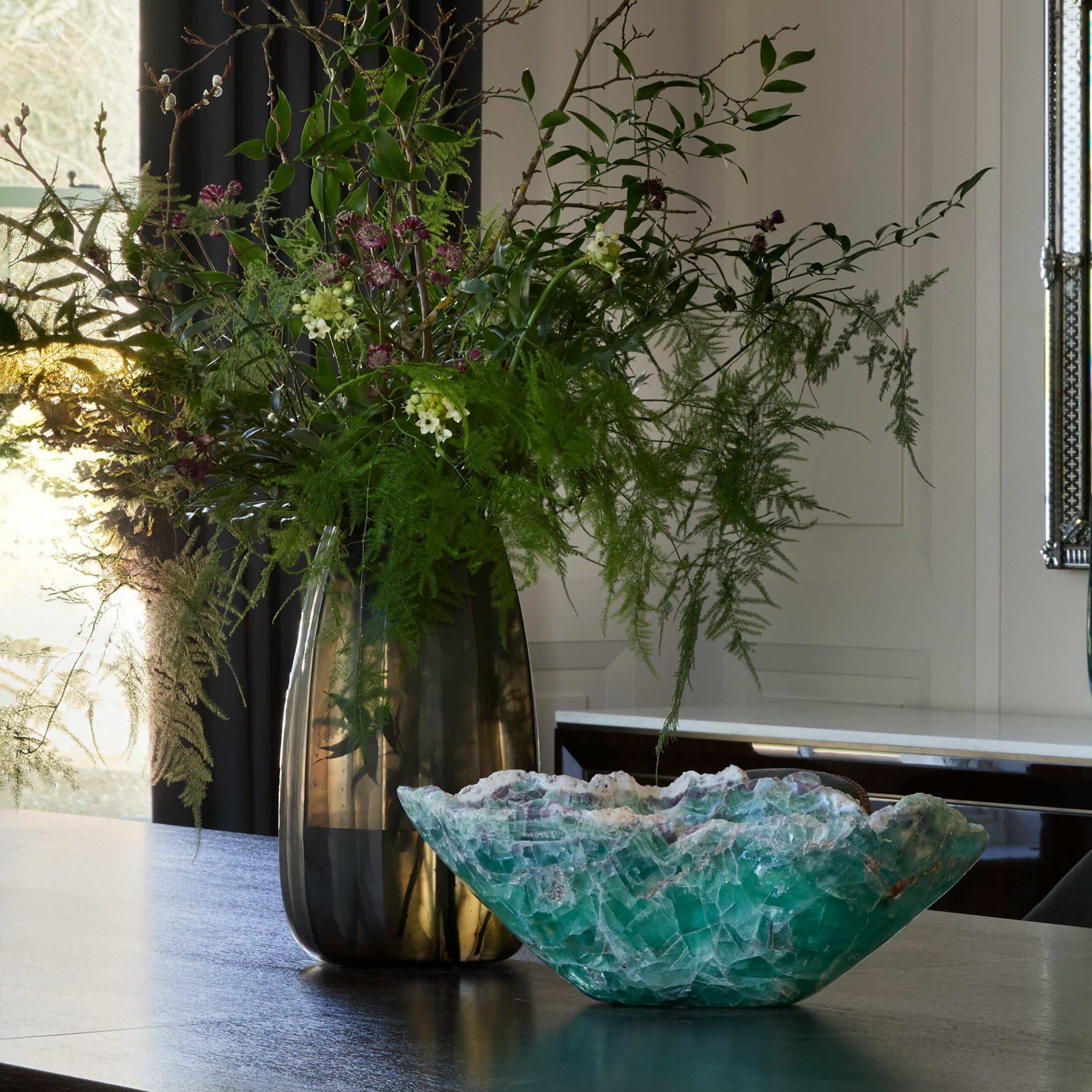 Unique fluorite crystal bowl, skilfully handcrafted making it a beautiful decorative piece for any room. The unpolished rim showcases the natural crystal formations at the top of the block.