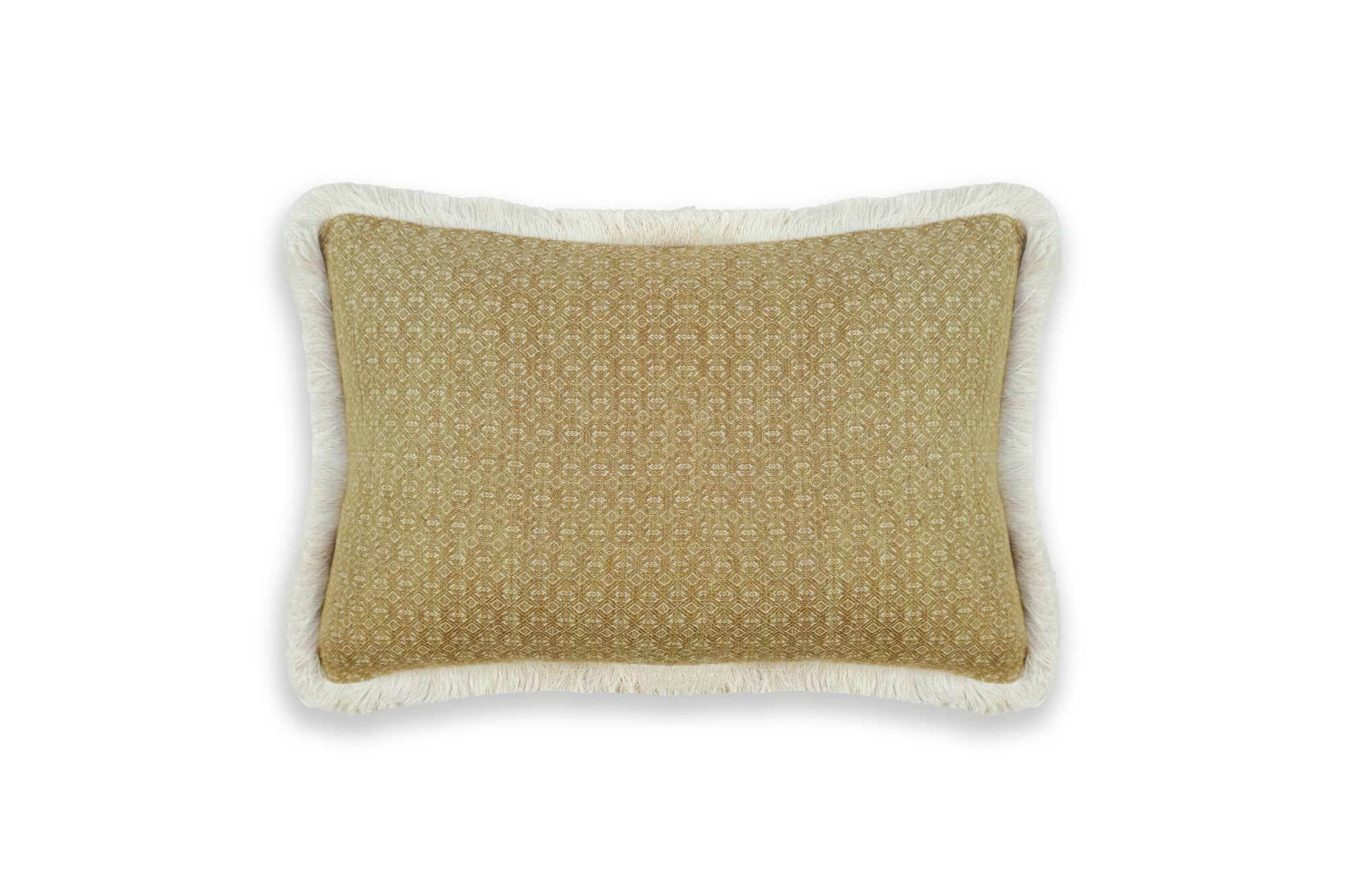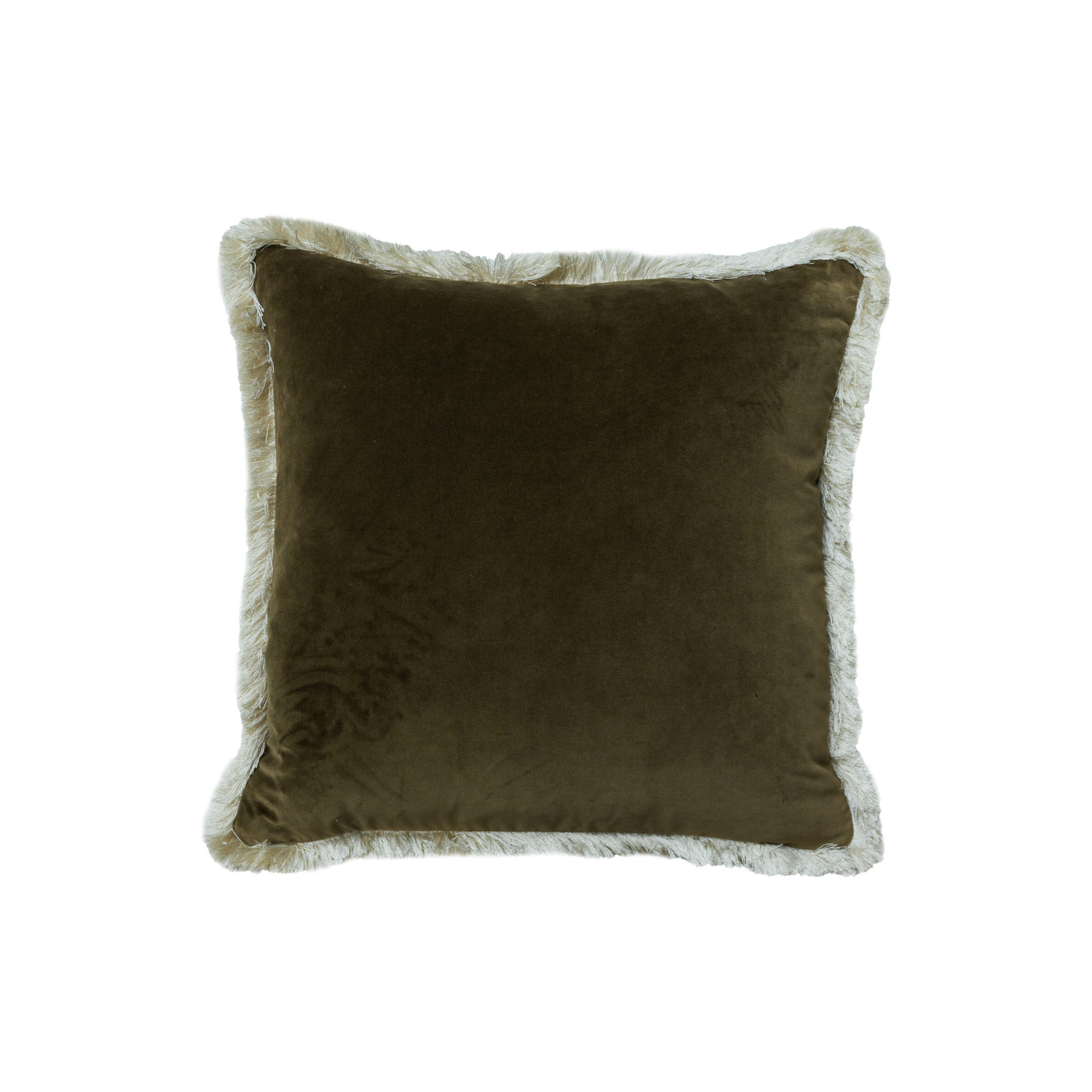 Olive green velvet cushion finished with a contrasting cream fringe. This luxurious cushion is perfect as a base for layering with other cushions, adding depth and texture.