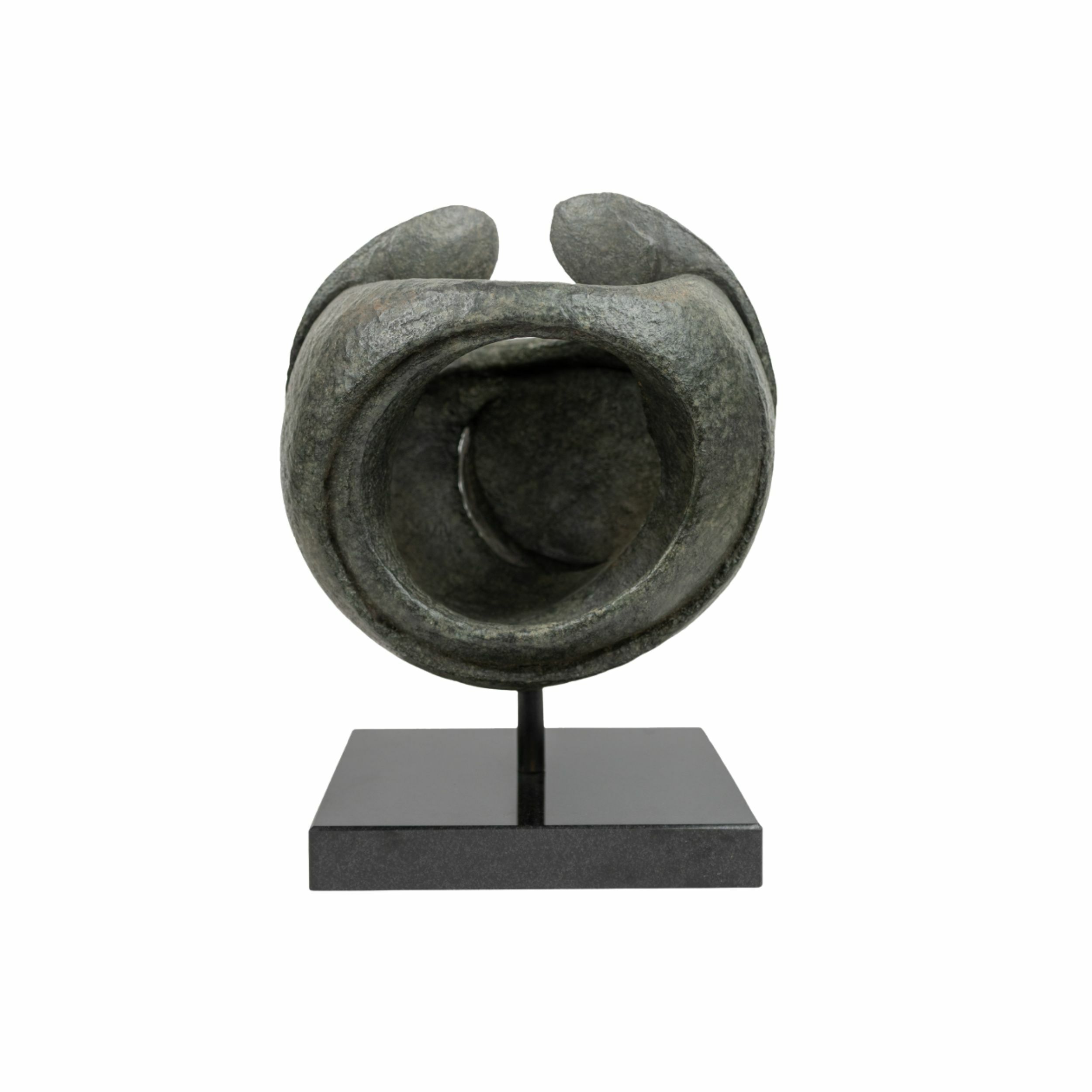 Abstract sphere sculpture featuring two interlocking forms and finished in a dark, textured bronze patina.