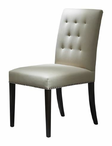 Elegant dining chair upholstered in a luxurious, subtly textured fabric in a neutral tone. It features a decorative scalloped edge along the outside back and bronze stud detailing. The chair is supported by tapered legs in a high-gloss walnut finish.