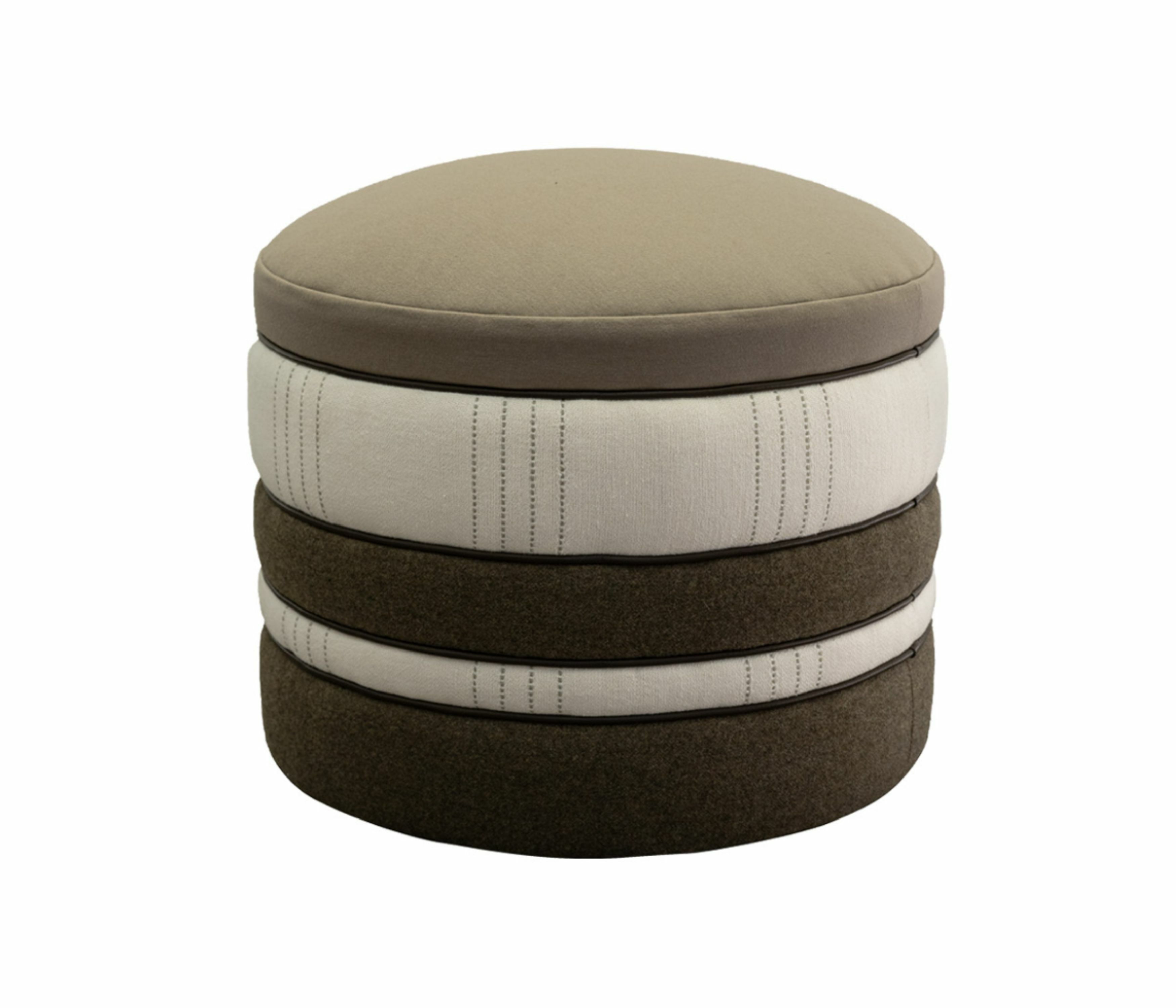 Upholstered round stool featuring a distinctive layered design and accented by piping detailing. Perfect for extra seating or as an accent piece for any room. Choose your fabrics from our Fabric Collection.