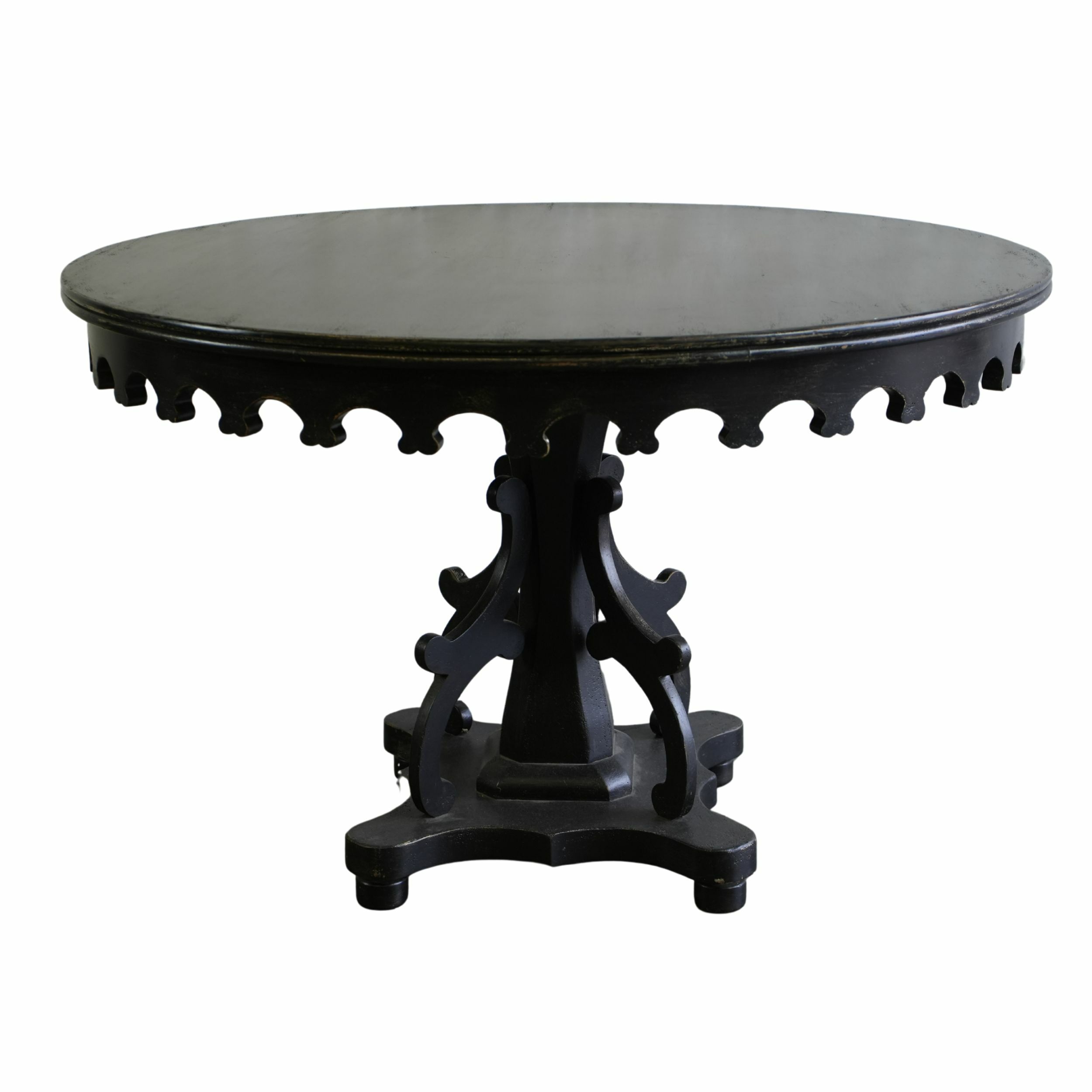 Vintage round, dark-wood dining table featuring an ornate scalloped apron and a sculpted pedestal base with curved supports for a classic, elegant look.
